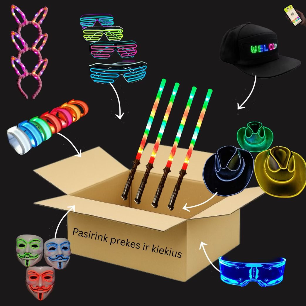 Nuomokis LED akinius, šviečiančias kepures, kaukes, lazdeles ir kitus aksesuarus pagal savo norus – mokėk mažiau nei produkto savikaina.